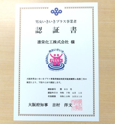 そうした働きやすい職場環境の整備に積極的に取り組む姿勢が認められ2020年11月には大阪府「男女いきいきプラス事業者」に、また同年12月には大阪市「女性活躍リーディングカンパニー」に認証されました。