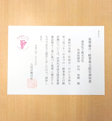 そうした働きやすい職場環境の整備に積極的に取り組む姿勢が認められ2020年11月には大阪府「男女いきいきプラス事業者」に、また同年12月には大阪市「女性活躍リーディングカンパニー」に認証されました。
